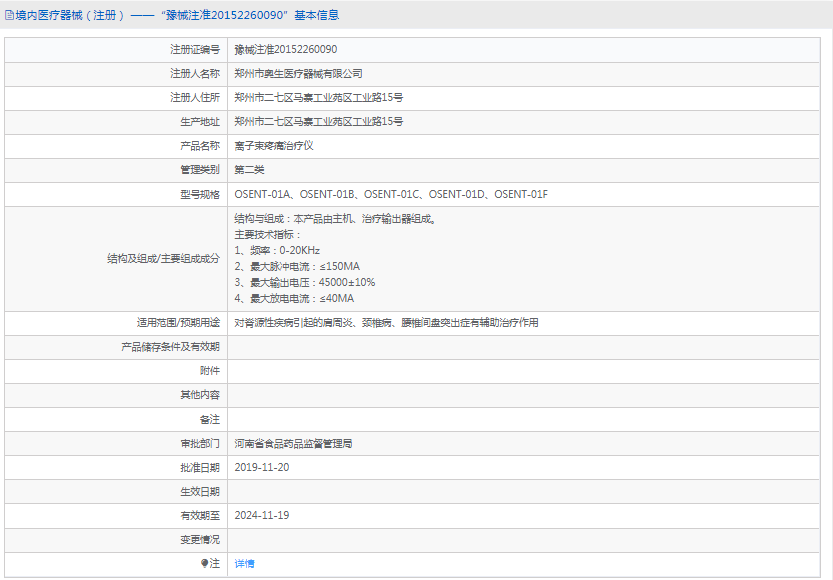 奥生离子束疼痛治疗仪OSENT-01B是由郑州市奥生医疗器械有限公司生产的***种医疗设备。这款治疗仪结合了电子技术与中***传统医学,主要用于治疗由脊源性疾病引起的疼痛。其工作原理基于达松伐疗法,结合中医电针疗法的特长,将原本仅能治疗浅部组织疼痛的电火花转化为离子束,从而扩展到治疗深部组织疼痛。治疗仪通过水针和药物对患者深部组织病灶部位产生综合治疗作用。