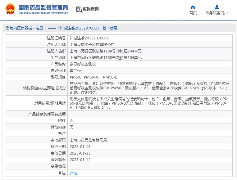 用于人体睡眠状态下相关生理信号的记录和统计,包括:血氧、脉率、血氧波形、胸式呼吸(PM50-B无此功能)、心率(PM50-B无此功能)、体位(PM50-B无此功能)和口鼻气流(PM50-A、PM50-B无此功能)。