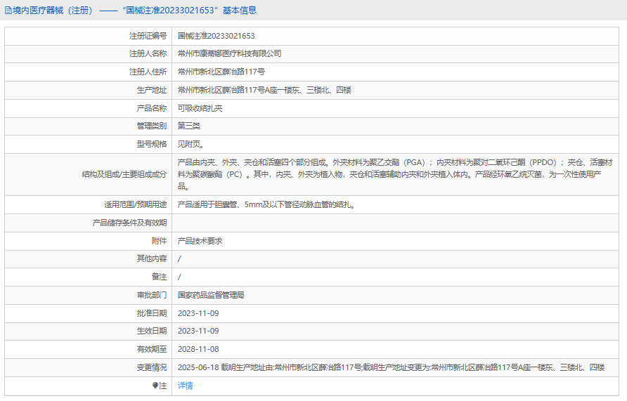 产品由内夹、外夹、夹仓和活塞四个部分组成。外夹材料为聚乙交酯(PGA);内夹材料为聚对二氧环己酮(PPDO);夹仓、活塞材料为聚碳酸酯(PC)。其中,内夹、外夹为植入物,夹仓和活塞辅助内夹和外夹植入体内。产品经环氧乙烷灭菌,为***次性使用产品。