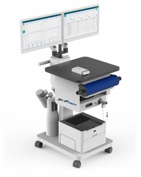 心肺运动测试系统由台车、数据采集盒、采样组件、流量压力变换器、面罩、心肺运动测试软件(版本V1)、主机、显示器组成,并具有蓝牙、USB接口、串口连接外置检测设备。