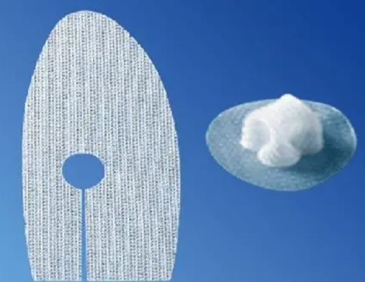 该产品由聚丙烯单丝编织的网片和聚丙交酯-己内酯材质可吸收膜复合而成,白色单丝无染料,蓝色单丝为酞青蓝染料染色,产品均带有引流孔。该产品经辐照灭菌,一次性使用。货架有效期为2年。