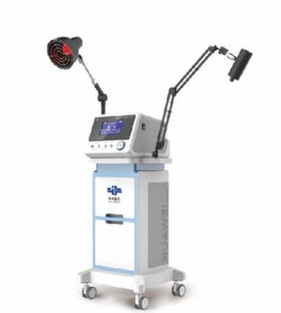 红外偏振光治疗仪由主机、四轮台车、悬臂、辐射器、治疗头、钯灯、电源线和紧急停止开关组成。